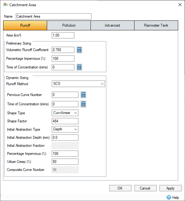 Urban Creep - This scales the impermeable area by the amount specified. This can be used to take the increase of urban areas, or other factors into account. This value is only enabled (and used) when the analysis creep of the Analysis Criteria is set to "Use Catchment Areas".