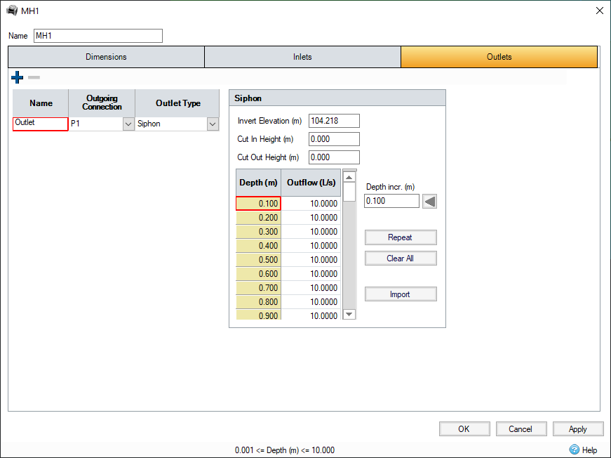 Siphon Outlets are similar to Depth Flow Outlet except that Cut In and Cut Out heights may be assigned in addition to its own performance curve.