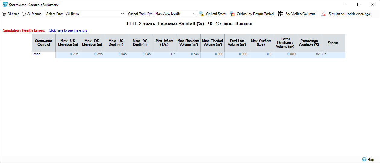 If the results of the analysis are showing issues for the current storm, or one of the storms if showing critical/all storms, a message will be shown at the top of the form. More information can be found in the Simulation Health section.