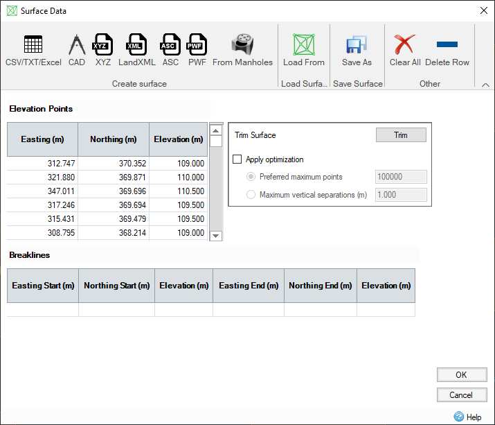Once loaded the data can be viewed and edited within the tables on the form if needed. When OK is clicked the software will perform a triangulation and save the surface file created to an IDSX file that is then referenced by the current phase. This file can be referenced by several different phases within the design to save disk space as well as being reused by other designs if needed.