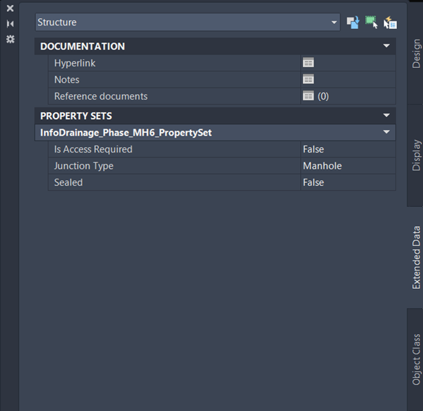 Some structures imported from an InfoDrainage design into the Civil 3D® design will have extended properties data that can be viewed and edited if applicable.