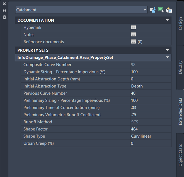 For example, a catchment imported from InfoDrainage will have various extra properties available in the Extended Data section of the Civil 3D® properties box. The extra properties visible will depend on the runoff method of the catchment area. Read only properties are disabled:
