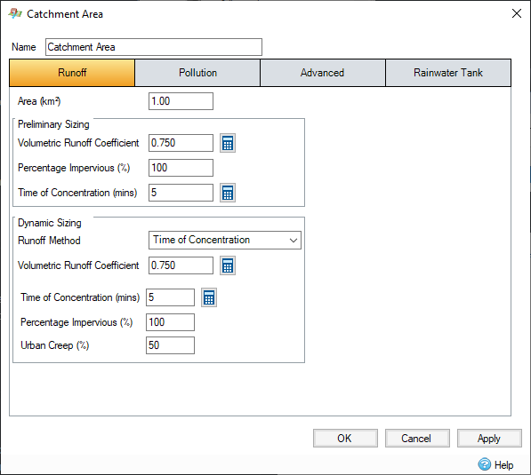 Urban Creep - This scales the impermeable area by the amount specified. This can be used to take the increase of urban areas, or other factors into account. This value is only enabled (and used) when the analysis creep of the Analysis Criteria is set to "Use Catchment Areas ".