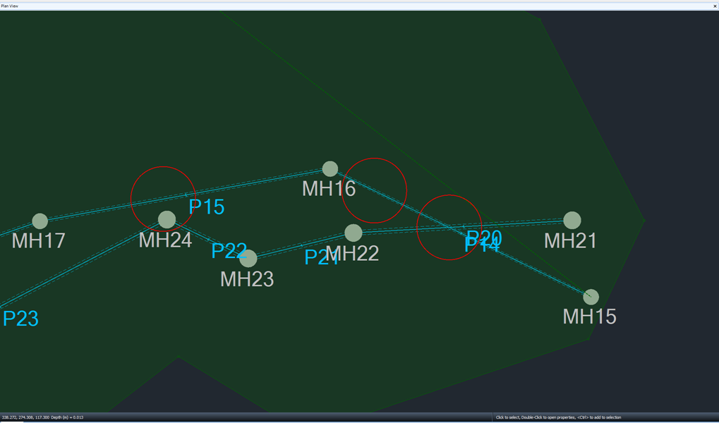 Clash Detection highlights any Connections, Junctions, or Stormwater Controls that are too close together.