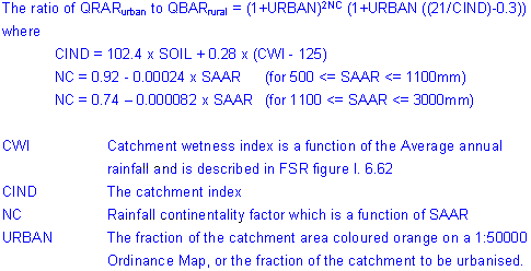 QBAR urban, Adjustment for urbanization - Calculated from IH report 124 equations 7.2 to 7.4. CIRIA Book 14, 3.2.2 (equations yield m³/s).