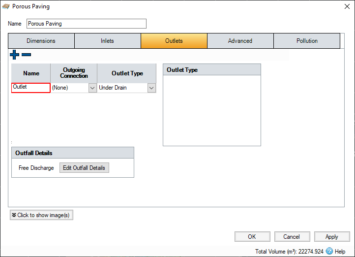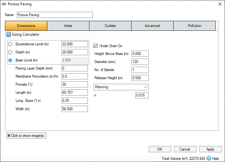 The actual parameters for the under drain are entered as part of the Stormwater Control dimensions, a Porous Paving is shown below as an example: