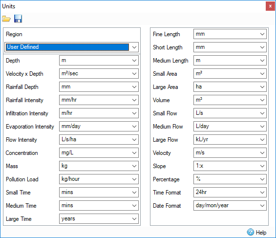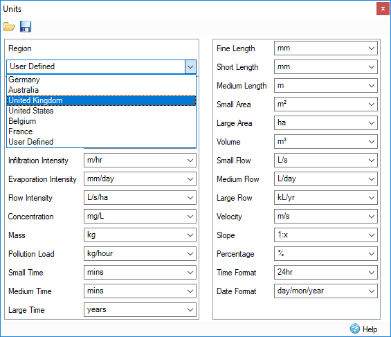 Files with unit translations (for region-specific units of measure) are loaded AUTOMATICALLY by the system following the pattern: xx-YY.idux, where xx stands for the language code and YY stands for the country code. For instance, en-US.idux is the name of an English file for the United States region, whereas de-DE.idux will apply German translations. The files can be found in the InfoDrainage installation directory, and the application will load all of the *.idux files found in the installation directory at runtime. Any customized unit files will have to be placed here by the user prior to opening InfoDrainage.