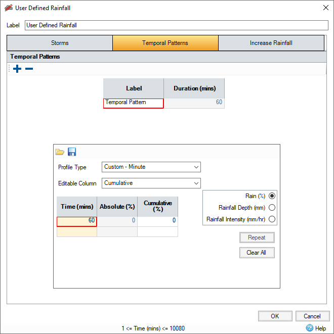 The Temporal Pattern forms allows the profile of the rainfall to be entered. This is then used to build an event from the duration and depth specified. For more information about this form, refer to Temporal Pattern.