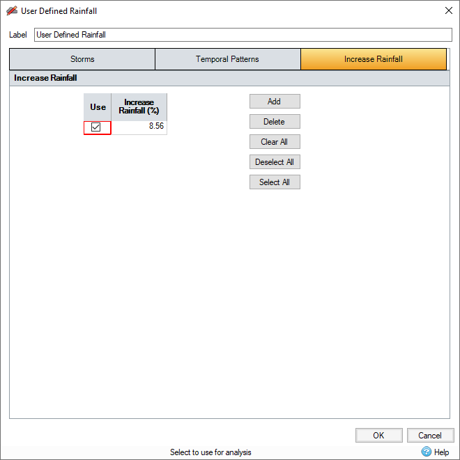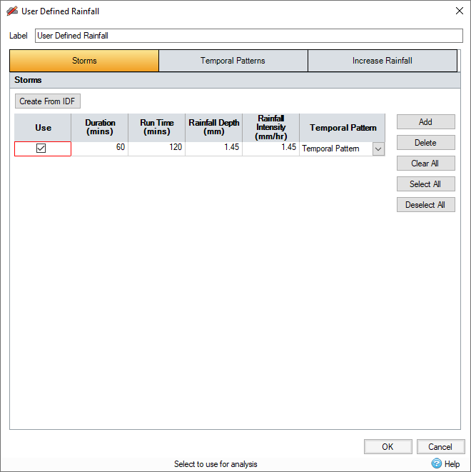 The User Defined Rainfall (Design Storm) option allows you to create one or more rainfall events using a Temporal Pattern based on a given duration and a total Depth (or Average Intensity).
