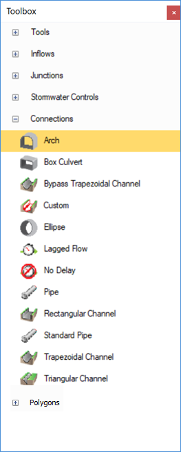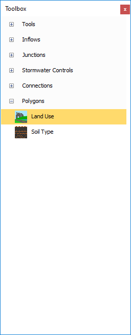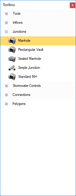 On the right-hand side of the screen we have the Toolbox which shows the functions and items that allow the creation of drainage schemes on the plan view. A default set of items are supplied with the software; additional items can be added through Object Templates.