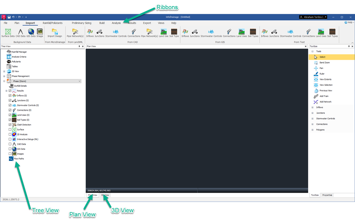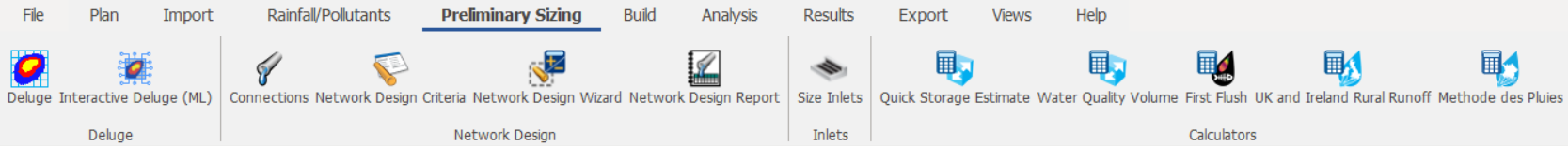 The ribbon tabs across the top of the screen give a simple, ordered approach to the typical workflow of managing site data and building a drainage scheme. There are quicker ways to access your data, but the ribbon tabs are a good way to begin.