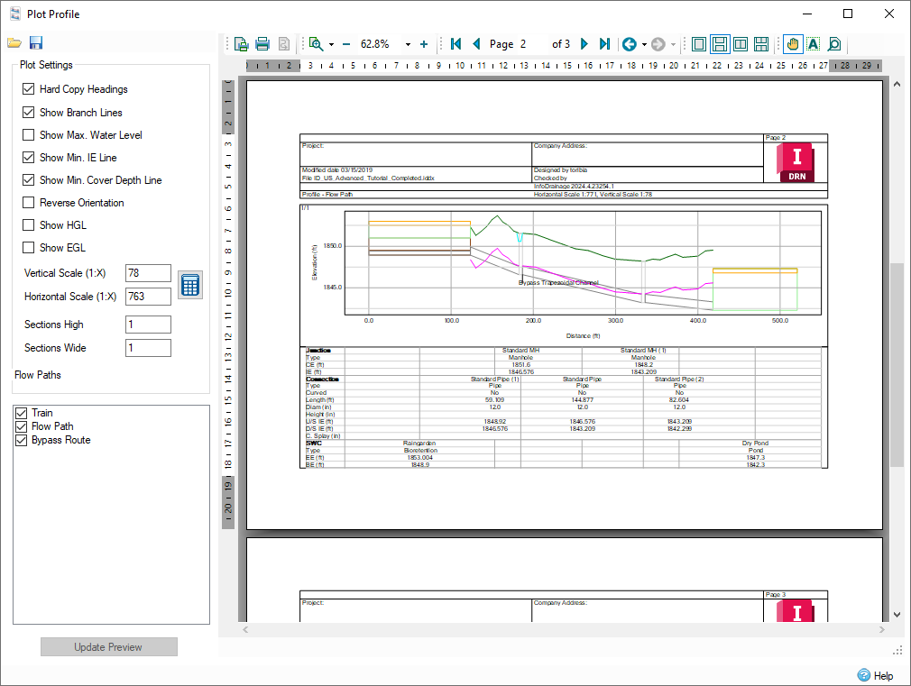 The Plot Profile tool allows you to preview all of the availableFlow Paths Profile and how they will be plotted. You can select the desired scales and output the plots to a printer for distribution. For more information about this topic, go to Plot Profile.