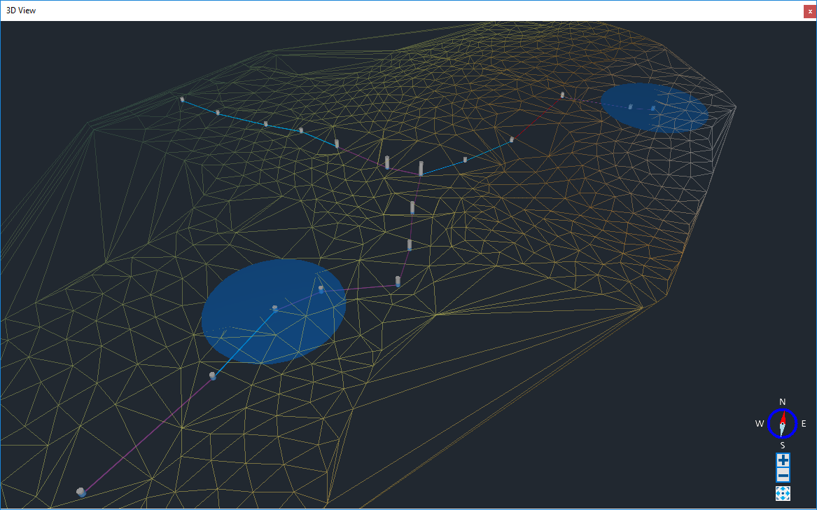 The 3D tab displays the three dimensional representation of the Plan View. It shows the locations and dimensions of Stormwater Controls (SWCs), Junctions, Connections, and Surface Data in three dimensions.