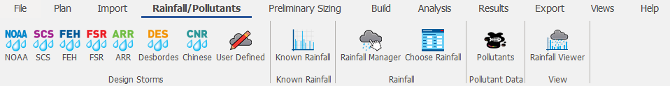 Import, create and manage rainfall records and pollutants. For more information about this topic, go to Rainfall Ribbon.