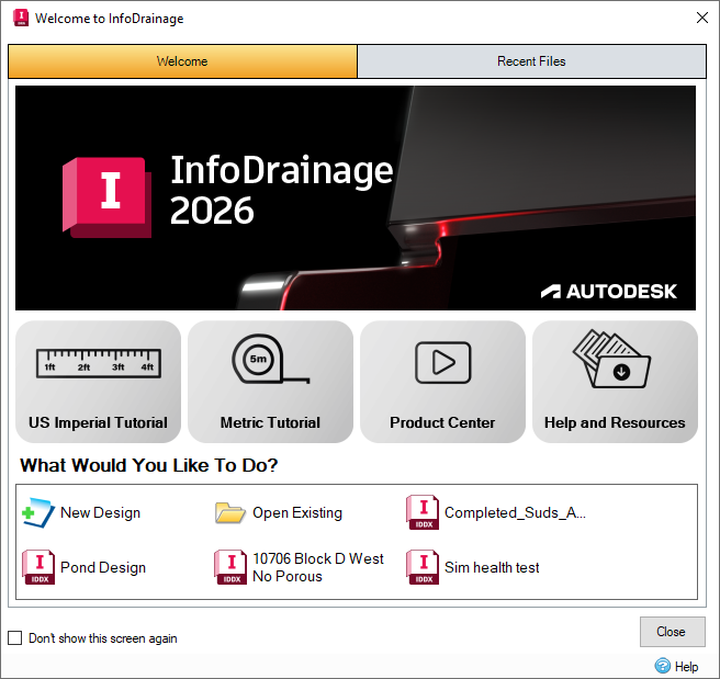 Once a license is setup this is the screen we see when opening InfoDrainage. Within the Welcome tab is the ability to access the tutorials (both Metric and Imperial). There are also links to recent webinars, as well as our Help and Resources webpages. The What Would You Like To Do? window displays other actions you can take, such as starting a new design or opening an existing file. Recent Files that have been opened are also listed in this window to allow users to jump back into projects they have been working on. The Recent Files tab lists the recent files in more detail, showing the file path, as well as the date that the document was last saved.