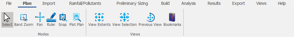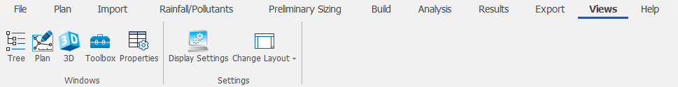 Views Ribbon provides options to open or select different windows in InfoDrainage as well as an easy way to Change Layout of the windows and configure the Display Settings. For more information about this topic, go to Views Ribbon.