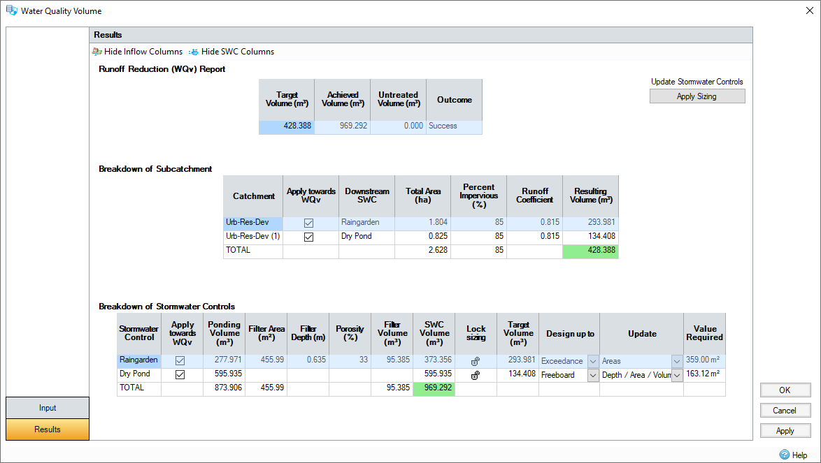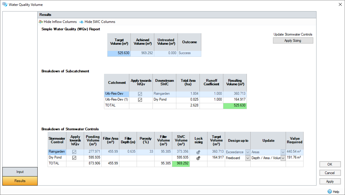 Apply Towards WQv (Global mode only)- Allows the SWC to be included, or excluded, from the calculations. This will remove it from the Achieved Volume total in the Summary table.
