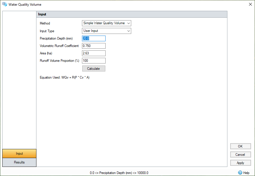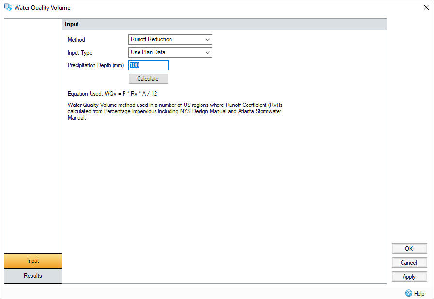 The Water Quality Calculator is based on two methods to calculate the resulting volume. The first method is a Simple Water Quality calculation and the second is the Runoff Reduction Water Quality calculation.