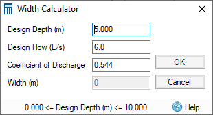 Width - Enter the width of the weir. If you are working to a maximum allowable discharge then a Calculator is provided to help size the control. This gives two additional parameters: