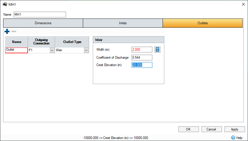 Weir Outlet allows a rectangular weir control to be modelled.