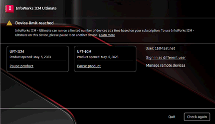 Based on your subscription, InfoAsset Manager licences may only be used on limited number of devices at any one time. When this limit is reached and you try to use the software on another device, a Device Limit Reached dialog is displayed. It lists the devices the software is currently being used on and lets you pause the usage on a selected device so that you can use the licence to access the software on the current device. An example is shown below.