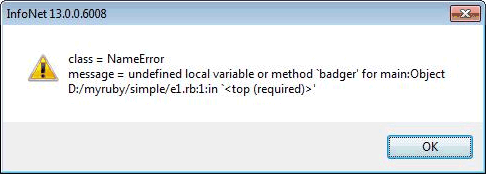 The precise meaning of the class = NameError and the main:Object will become apparent later, but the important part of the message is 'undefined local variable or method 'badger'' and the line number of the script in which it occurred. Your text editor should have some way of showing you the line numbers. Textpad, for example, shows the current line number on the status bar, and can show the line numbers at all times if you select the 'Line Numbers' option on the View menu'. What this message means is that you are trying to do something with the value of a variable which has not had a value set. Variables come into existence when values are set for them, not when you attempt to get values from them, therefore to output the value of a variable badger without setting it is an error. It could, of course, also be that you meant to output the string 'badger' in which case you should have said the following: