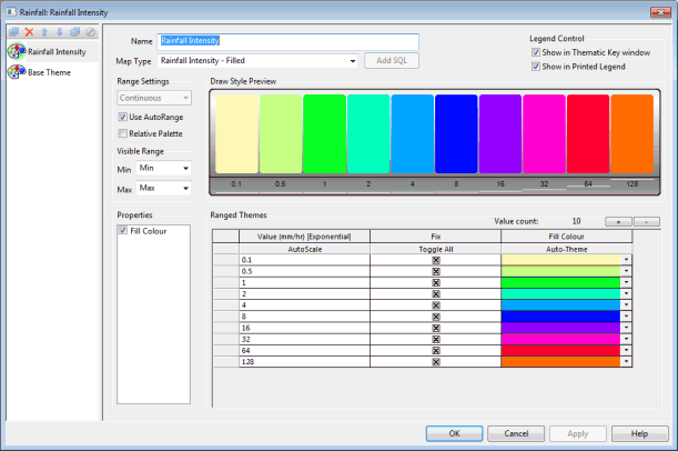 - The default rainfall theme is called Rainfall Intensity. It is based on rain intensity and the default Map Type is Filled but other types are also available (see table below). Fill contours of rain intensity values have been auto-themed so the Draw Style Preview displays a set of colours as shown in the image above.