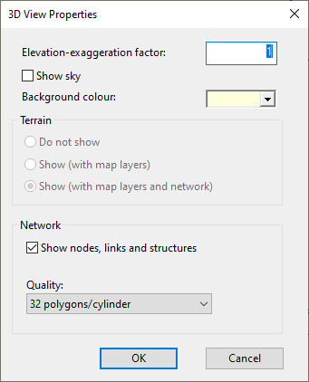This dialog allows you to change some of the display properties of the 3D Network Window. It is displayed when you right-click on the view and choose Properties from the popup menu.