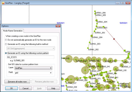 GIS data from a nominated layer in the GeoPlan will be appended to the node name. When using the {G} variable, the Get GIS data for custom pattern from section will become available. This section contains dropdown lists of Layers displayed in the GeoPlan and the Fields of the selected Layer. This is of particular use when using a coordinate grid layer. Example