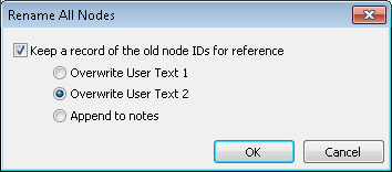 Existing Node IDs will be overwritten by the renaming process. To keep a record of existing Node IDs, check the Keep a record of the old node IDs for reference box. Choose to store old node IDs in User Text 1 or User Text 2 fields (this will overwrite any existing data in these fields), or to append the node ID information to the Notes field.