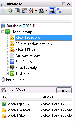 Find in Database Dialog. Type in text to search for and the property to search e.g. Name or type. Items found will be displayed in the Find Window.