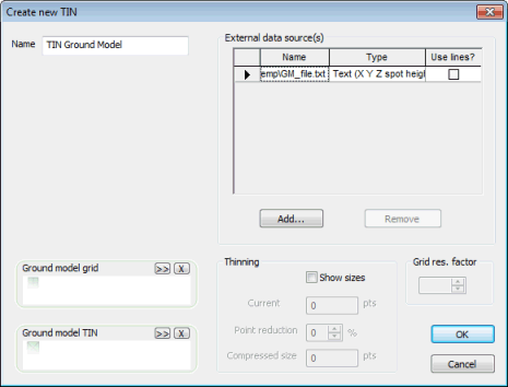Used when creating a TIN Ground Model from external data. Name - path of external data file Type - type of external data file Use lines? - enforce polylines as TIN edges |