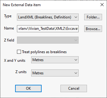 LandXML (Datapoints, Contours): contains x, y, z points. Note that the Treat polylines as breaklines box must be checked to enforce the polylines as TIN edges