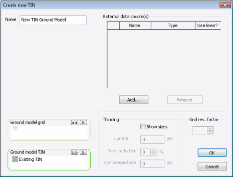 A new TIN can be created using an existing TIN or Grid ground model. These may be used in addition to external data sources.