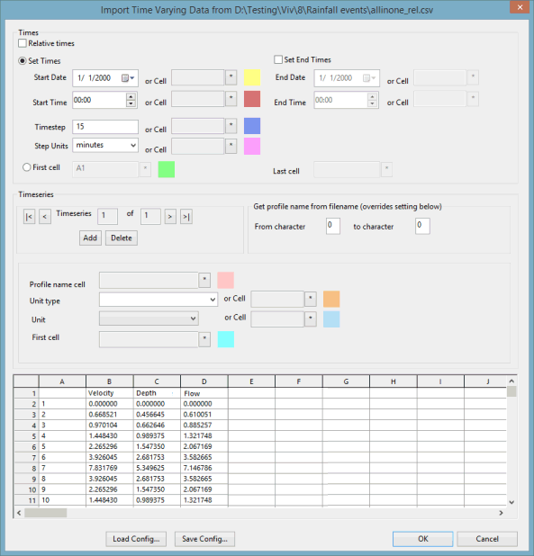 This dialog is a generic importer for time varying data. You can identify a column containing time information, or set a start time and timestep for the data. For each column of time varying data a unit type can be set.