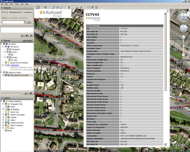 An InfoAsset Manager network can be viewed as an overlay in Google™ Earth, showing the objects' location on the aerial photography. It is possible to save the active network from the current GeoPlan Window as a KMZ file. See the Export to KMZ for Google Earth dialog topic for more details on how to create the KMZ file from within InfoAsset Manager and how to customise the export file.