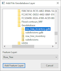 Select the folder that contains the File Geodatabase, then select the Feature Layer that contains the data you wish to display in the GeoPlan, and click Add Feature Layer.