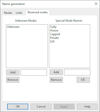 The Reserved nodes tab is used to set up reserved names for use as the US Node ID and/or DS Node ID of unconnected pipes.