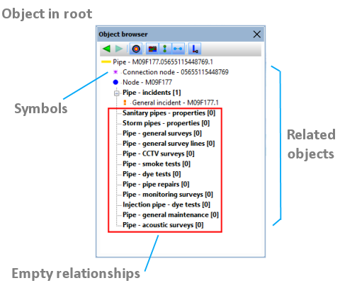 The possible types of related objects are shown below the selected object. Relationship description is displayed in bold, with, in brackets, the number of objects within that relationship.