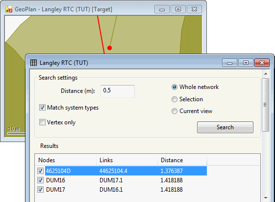 - Click the Search button to list nodes that lie within the search distance of another pipe and match the criteria selected above.