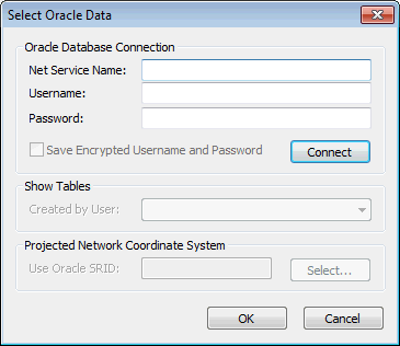 The Select Oracle Data Dialog is used when importing data from an Oracle database via the Open Data Import Centre, or exporting data to an Oracle database via the Open Data Export Centre. The dialog is displayed when browsing for a file in the Open Data Import Centre Dialog or Open Data Export Centre Dialog.