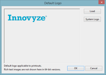 A default logo to be used in the printouts of these views can be set in the InfoAsset Manager via the Default Logo dialog. The logo can be loaded from a Rich Text (.rtf) file, or the InfoAsset Manager default can be used.