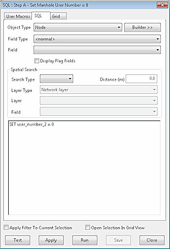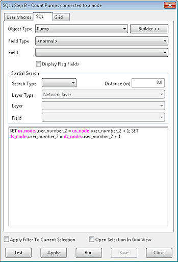 In the example network in question, it is invalid to connect a Pump object directly to another Pump object. This series of SQL Queries makes use of the user defined field User Number 2 to count connections to pumps. At the end, any pump that is connected directly to another pump will be selected.