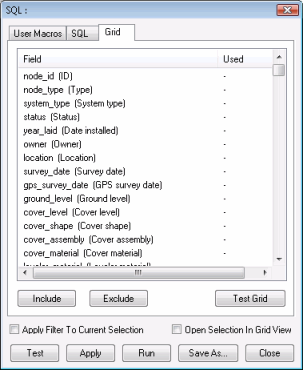 The fields that may be displayed on the grid are listed. To include a field on the grid, click on the field and then on the Include button; the Used column has a value of Yes against the included field. To remove a field from the grid, click on the field and then on Exclude.