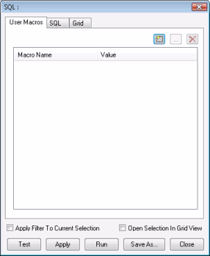 The User Macros tab on the SQL dialog lets you create variables for representing values within the query. These variables are called macros.