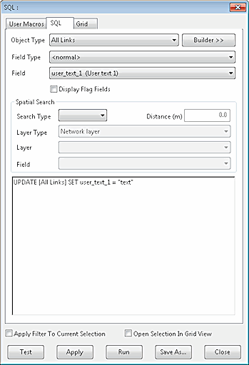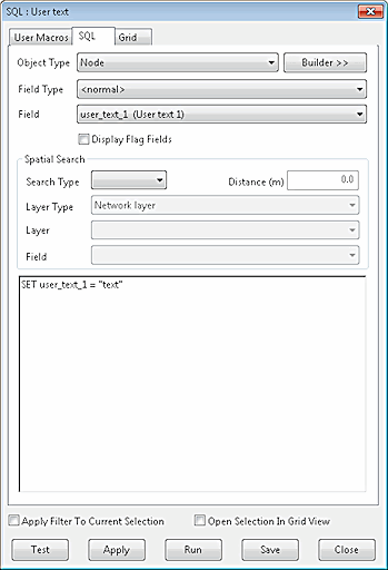 Sets user_text_1 field to text for all objects of the chosen object type (selected in the Object Type field of the SQL dialog).