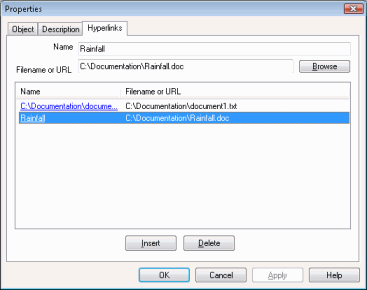 - Click the hyperlinked item in the Hyperlinks list. This displays the name and linked data path in the Name and Filename or URL boxes at the top of the page.