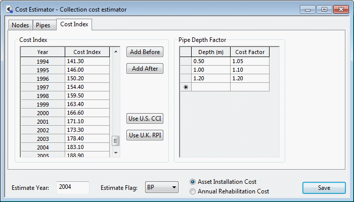 Any Cost Index value in the grid may be modified by clicking in the cell and editing the value. Additional data may be added one year at a time, for years before or after the current the current data set. Click on the Add Before or Add After button and edit the new value to that required.