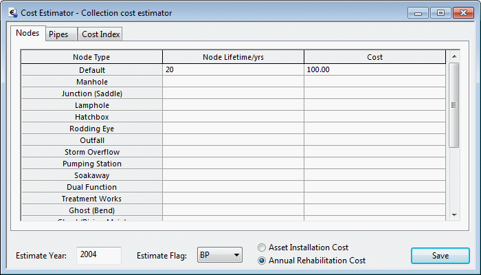 The Nodes page contains a grid that specifies the lifetime and installation/rehabilitation cost for each type of node in the database. It is not required to specify information for all node types. Any fields left empty will take the value specified in the Default row of the grid.