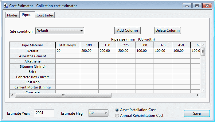 The Pipes page contains a grid of costs varying according to pipe material and pipe width. The pipe installation/rehabilitation costs in the grid are specified per unit length of pipe. Adjusting the Site Condition setting shows a new grid of values that may be specified (for example costs of pipes laid under a road will be different for those in unpaved areas). Any fields left empty will take the value specified in the Default row of the grid.
